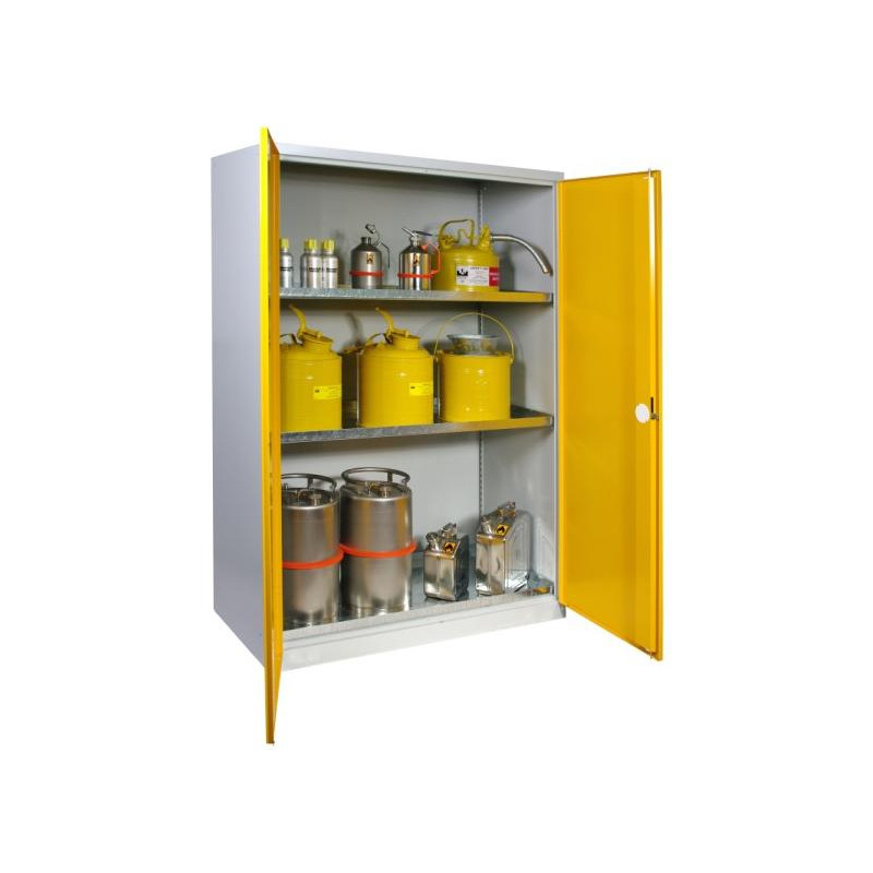 Armoires basses de sécurité capacité 300 litres. Livrée avec 4 bacs de rétention en acier zinguée (capacité / bacs : 26 litres)