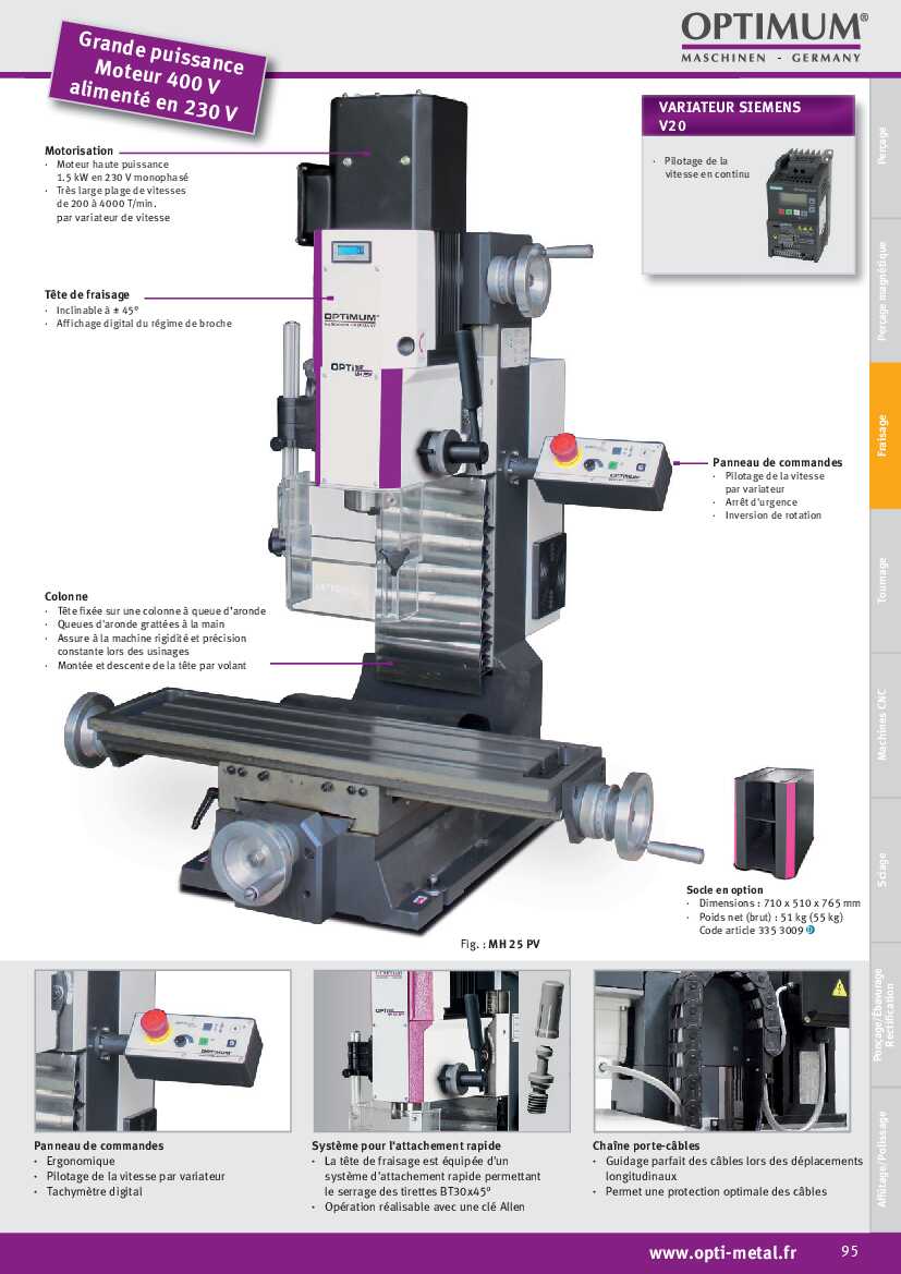 Perceuse-fraiseuse de haute précision rigide et très puissante. Equipée d’un variateur de vitesse Sinamics V20 avec tachymètre de vitesse de broche.