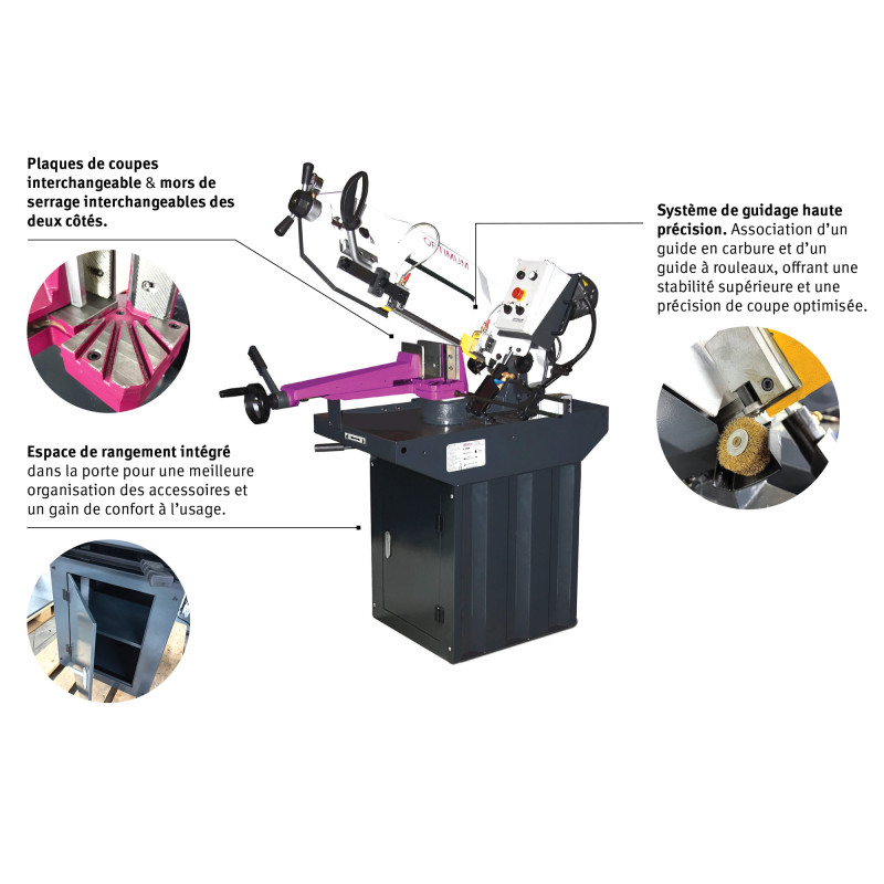 Scie à ruban professionnelle idéale pour la maintenance. Avec archet orientable et descente hydraulique par vérin.