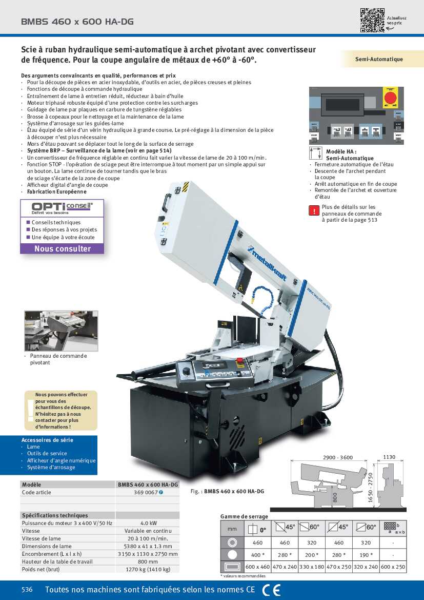 Scie à ruban hydraulique semi-automatique à archet pivotant avec convertisseur de fréquence. Pour la coupe angulaire de métaux de +60° à -60°.
